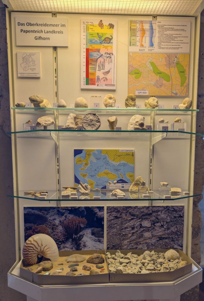 Die Vitrinen-Ausstellung zeigt ab dem 11. Oktober einen Querschnitt der Meeresbewohner des Kreidemeeres, die im Campan, vor 70-80 Millionen Jahren, den Bereich der Kreidemulden bei Meine besiedelten.